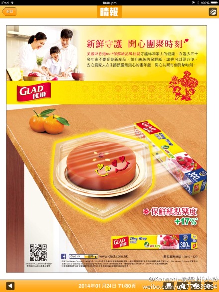 【#馬年快消#44】佳能Glad保鮮紙(保鮮膜)在香港的廣告。小粉點評:①團(tuán)年飯,佳能守護(hù)開心團(tuán)聚時刻(圖片是香港的年糕) ②美國和香港No1 品牌,香港的零售數(shù)據(jù)當(dāng)然也是來自尼爾森 ③附上實驗室報告,量化保鮮膜粘緊度比老品提高+17%。