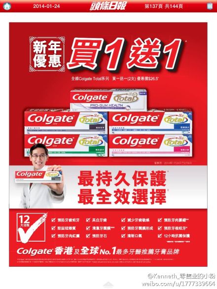 【#馬年快消#41】香港高露潔Total系列也推出了買1送1的新年優(yōu)惠。因為很多“最”的廣告詞,廣告的小字特別多