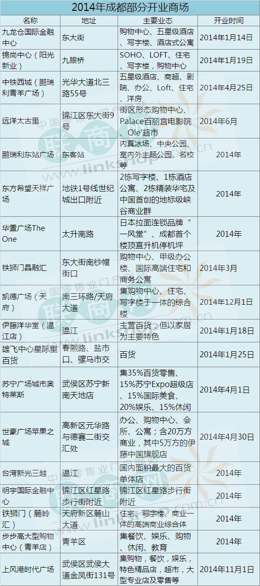 據(jù)聯(lián)商網(wǎng)了解,遠(yuǎn)洋太古里、鐵獅門晶融匯、華置廣場(chǎng)THE ONE購(gòu)物中心、新光三越、鵬瑞利青羊廣場(chǎng)、鵬瑞利東站廣場(chǎng)、東方希望天祥廣場(chǎng)、凱德天府、雄飛中心、龍湖時(shí)代天街1期、蘇寧廣場(chǎng)城市奧特萊斯、藍(lán)光空港韓國(guó)城等商場(chǎng)也將于2014年投入運(yùn)營(yíng)。