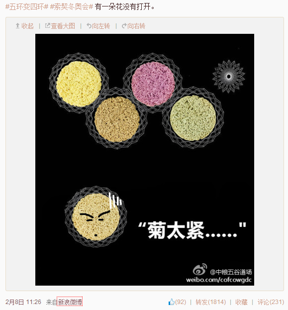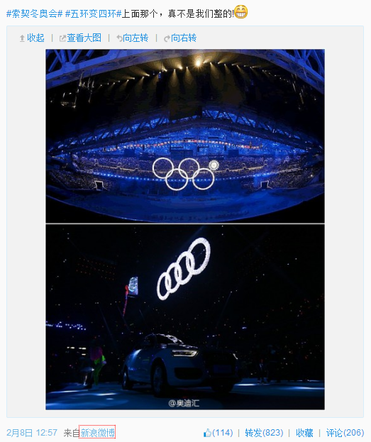 這兩天索契冬奧會(huì)開幕式的「四環(huán)」尷尬成了微博熱點(diǎn),也成了很多官方微博想要吃一口的營銷盛宴?上,在小曹看來,「盛」還能勉強(qiáng)稱得上,「宴」卻沒有大廚出手,賣相平平,味道寡淡。