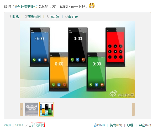 這個(gè),小曹想偷偷問下微博運(yùn)營,是開工紅包發(fā)少了么?按小米的路子,小曹發(fā)這條微博,會(huì)是四個(gè)點(diǎn)亮的小米和一個(gè)黑屏的小米,文案往「打開之后更炫麗/多彩」之類靠,或者「給你更多期待」之類,然后小曹就看到了小米粉絲后援會(huì)的微博: