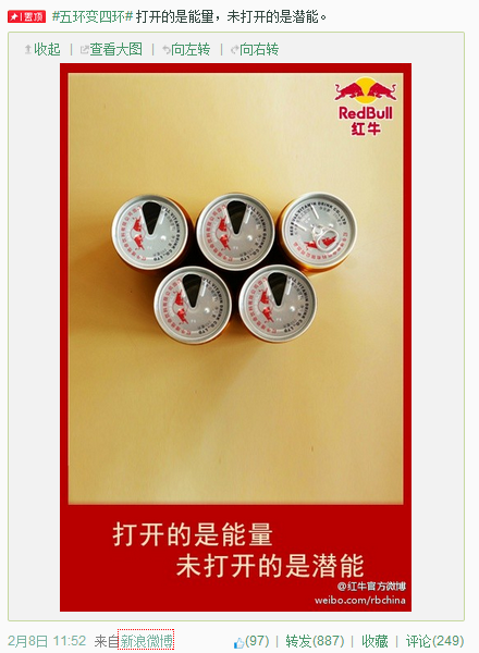 「打開的是能量,未打開的是潛能」!大贊紅牛!這條微博轉(zhuǎn)發(fā)和評(píng)論比例分別超過8.6‰和2.4‰,比奧迪匯的微博強(qiáng)太多!