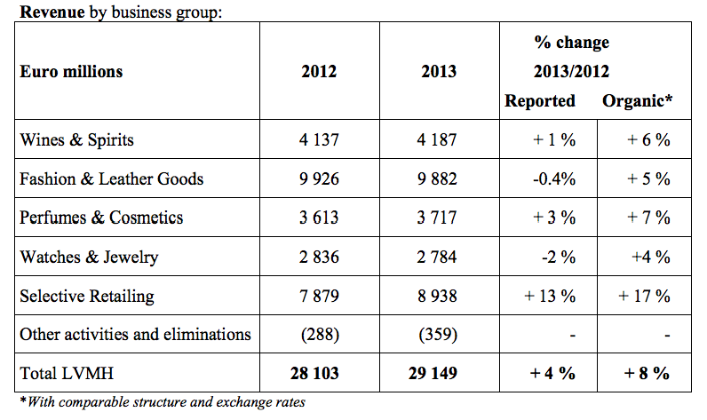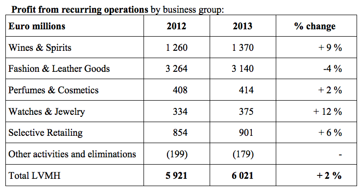 全球第一大奢侈品集團(tuán)LVMH近期發(fā)布了2013年全年業(yè)績(jī)簡(jiǎn)報(bào):