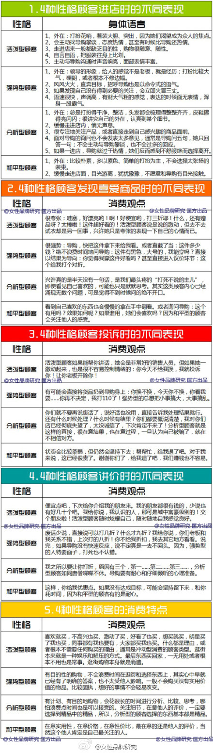 很多微博說過顧客要分門別類。但問題是,他們從來沒說過,這些不同性格的顧客進店時,有哪些不同表現(xiàn)?當她們發(fā)現(xiàn)喜愛商品時,有哪些不同表現(xiàn)?她們投訴時又有哪些不同?講價也有細微的差別,這些細節(jié)、極致的問題,你可以在下圖中找到答案!
