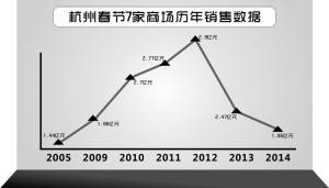 一個(gè)星期前,幾乎各家百貨店大佬的手機(jī)上都收到一條來(lái)自杭州市貿(mào)易局的統(tǒng)計(jì)數(shù)據(jù):“2014年春節(jié)黃金周,杭州7家商場(chǎng)的銷(xiāo)售‘整體下滑25%’,參與統(tǒng)計(jì)的分別是杭州大廈、解百、銀泰百貨系的武林店、百大店、西湖店、慶春店和利群店。”