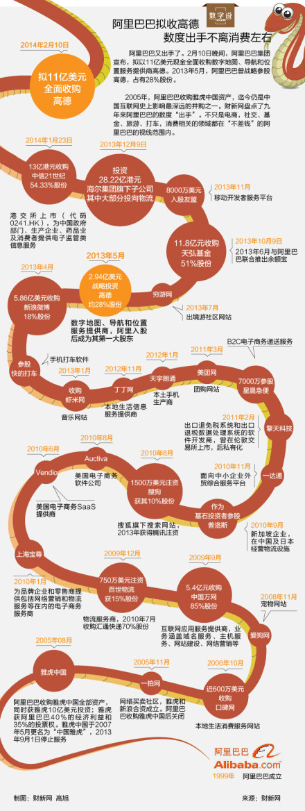 從2005年到2014年,近10年的時間阿里巴巴收購了27家企業(yè),其中大多是互聯(lián)網(wǎng)企業(yè),與物流相關(guān)的百世物流、一達通、海爾日日順...如圖(財新網(wǎng))