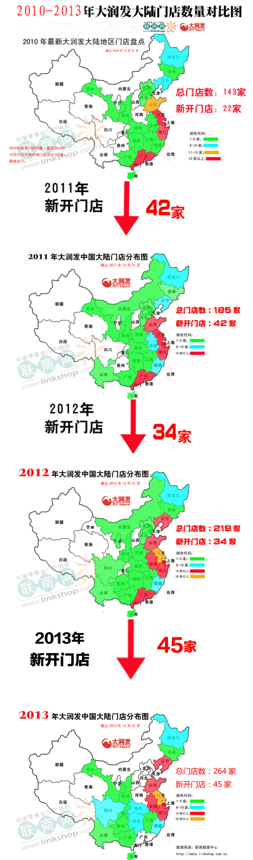 。▓D為:2010-2013年大潤(rùn)發(fā)在華門店數(shù)量對(duì)比圖)