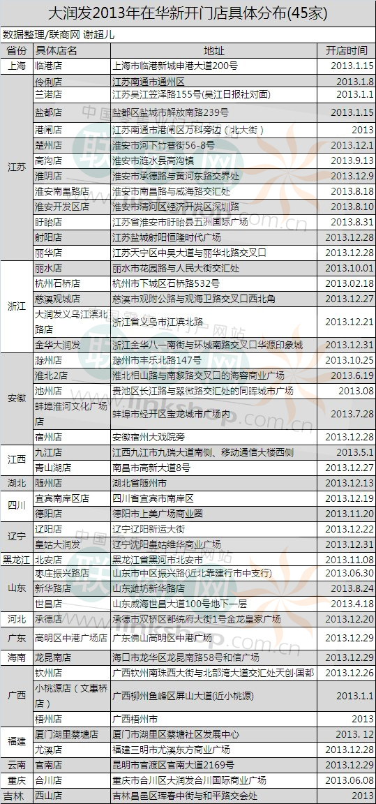 據(jù)聯(lián)商網(wǎng)統(tǒng)計(jì),截止2013年12月31日,大潤(rùn)發(fā)在華門店總數(shù)達(dá)264家,其中,2013年在華新開45家門店,首次進(jìn)入重慶市。其中上海1家,江蘇12家,浙江5家,安徽5家,江西2家,湖北1家,四川2家,遼寧2家,黑龍江1家,山東3家,河北1家,廣東1家,吉林1家,海南1家,廣西3家,福建2家,云南1家,重慶1家。2013年新開門店具體分布如下: