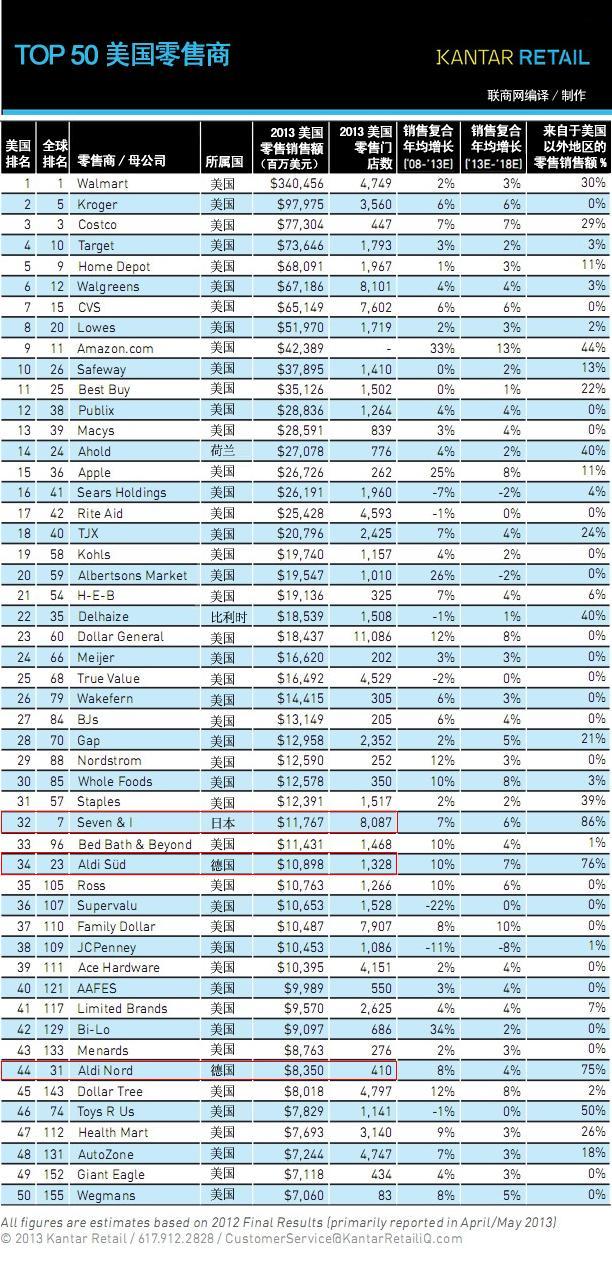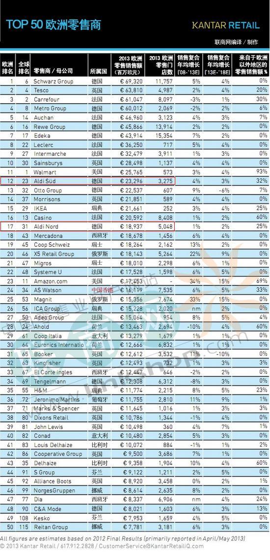 昨天看到聯(lián)商網(wǎng)公布2013年歐美超市的排行榜,沒看別的,只看阿爾迪,做了一個簡單的分析給大家參考共享: