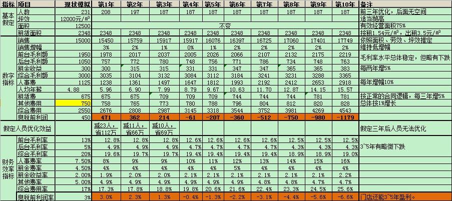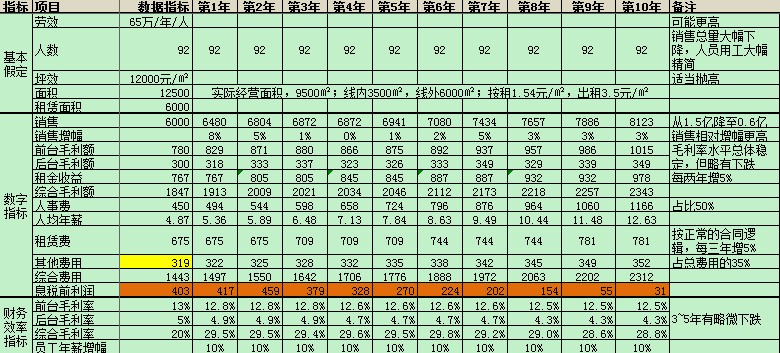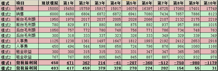 各種承租面積不變、前后臺(tái)毛利率水平不變,模擬如下: