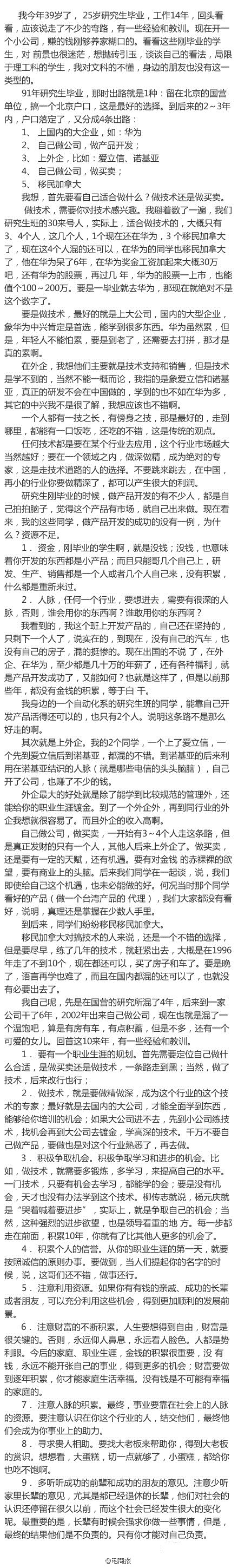 我今年39歲了, 25歲研究生畢業(yè),工作14年,回頭看看,應(yīng)該說走了不少的彎路,有一些經(jīng)驗(yàn)和教訓(xùn),F(xiàn)在開一個(gè)小公司,賺的錢剛夠養(yǎng)家糊口的?纯催@些剛畢業(yè)的學(xué)生,對(duì)前景也很迷茫,想拋磚引玉,談?wù)勛约旱目捶,局限于理工科的學(xué)生....