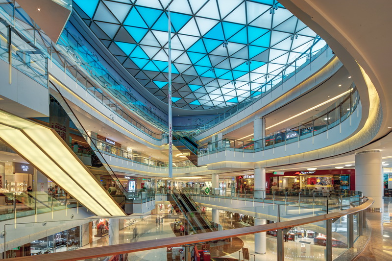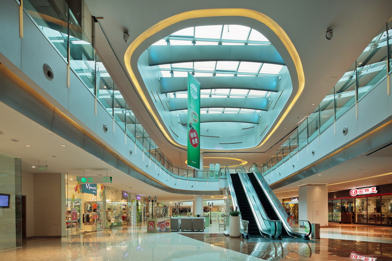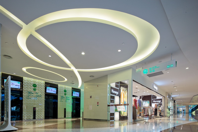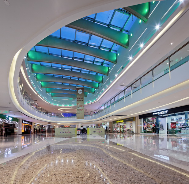 主中庭位于商場的核心區(qū),與主入口相連,強調(diào)了區(qū)域的識別性和引導性,將人流迅速引入商場內(nèi)部,形成良好的互動。從“流水”的主題元素中提煉出波紋的形態(tài),并結(jié)合光影打造出一個極具商業(yè)特色的“水中庭”。