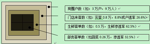 如蔬菜,對(duì)于區(qū)域內(nèi)3萬家庭,核心圈若占60%即1.8萬戶家庭,目前購買率我們簡(jiǎn)單認(rèn)為僅有2600戶,未來我計(jì)劃提升至4000戶,可據(jù)此設(shè)計(jì)系統(tǒng)的全天候目標(biāo),這樣的全天候目標(biāo)設(shè)置,不是憑空設(shè)定的。