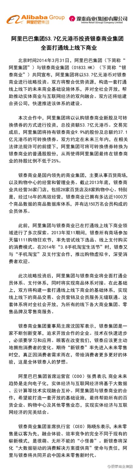 阿里巴巴宣布入股銀泰商業(yè)(01833.HK),以53.7億港元占有9.9%股份(未來(lái)25%)。浙商好基友馬云和沈國(guó)軍成了一家人,他倆在云鋒基金、阿里小貸、雙11、菜鳥(niǎo)物流等都有合作。阿里電商+銀泰全國(guó)零售網(wǎng)絡(luò),與萬(wàn)達(dá)、京東、微信多方競(jìng)爭(zhēng)。線上雖易,線下不易,且行且珍惜2014-03-31 08:55被設(shè)為精華,積分加20,金幣加4