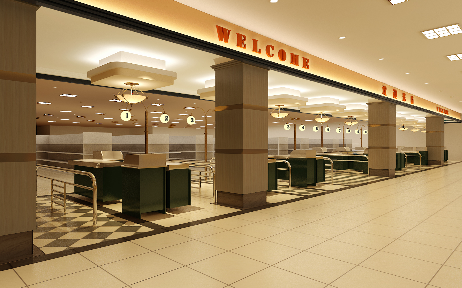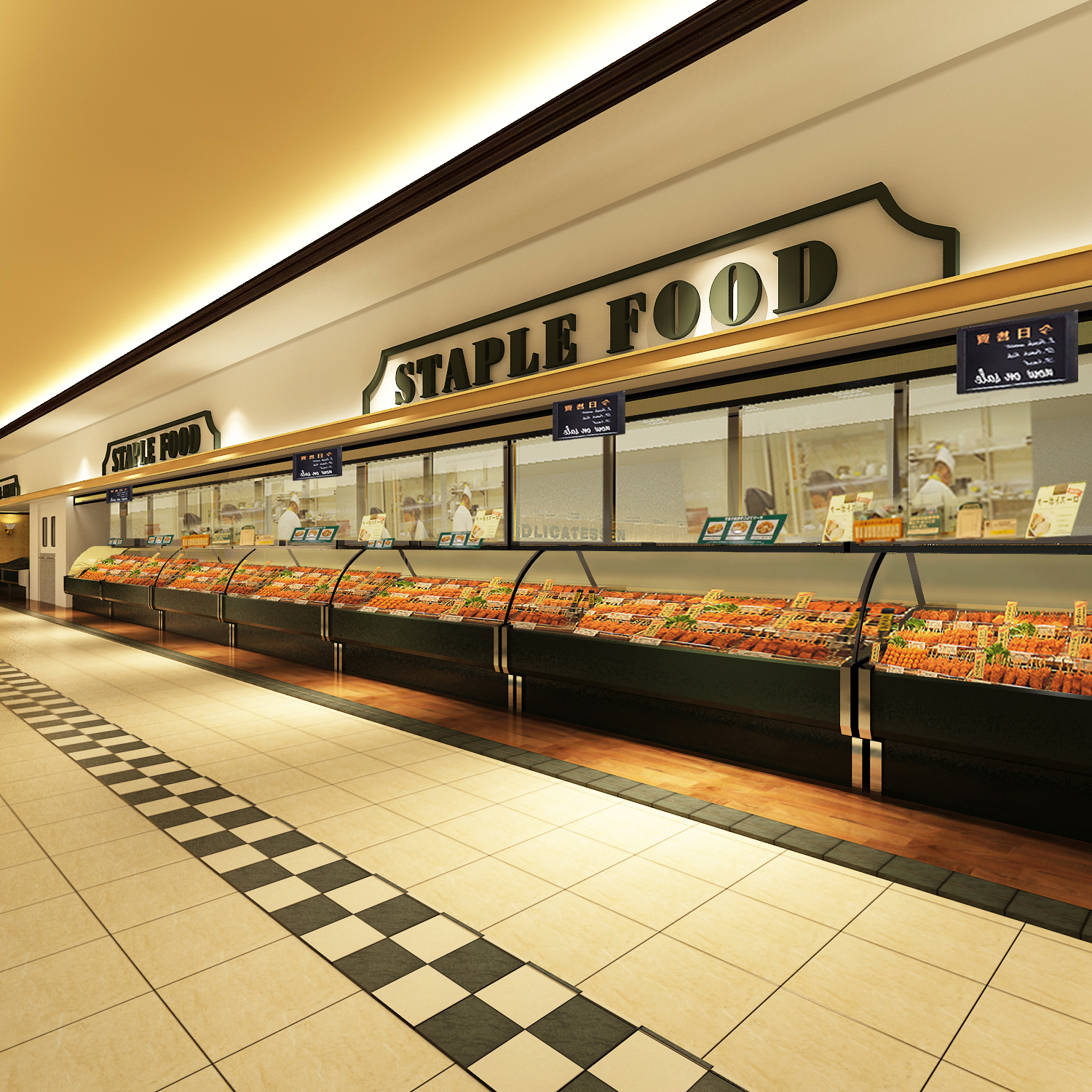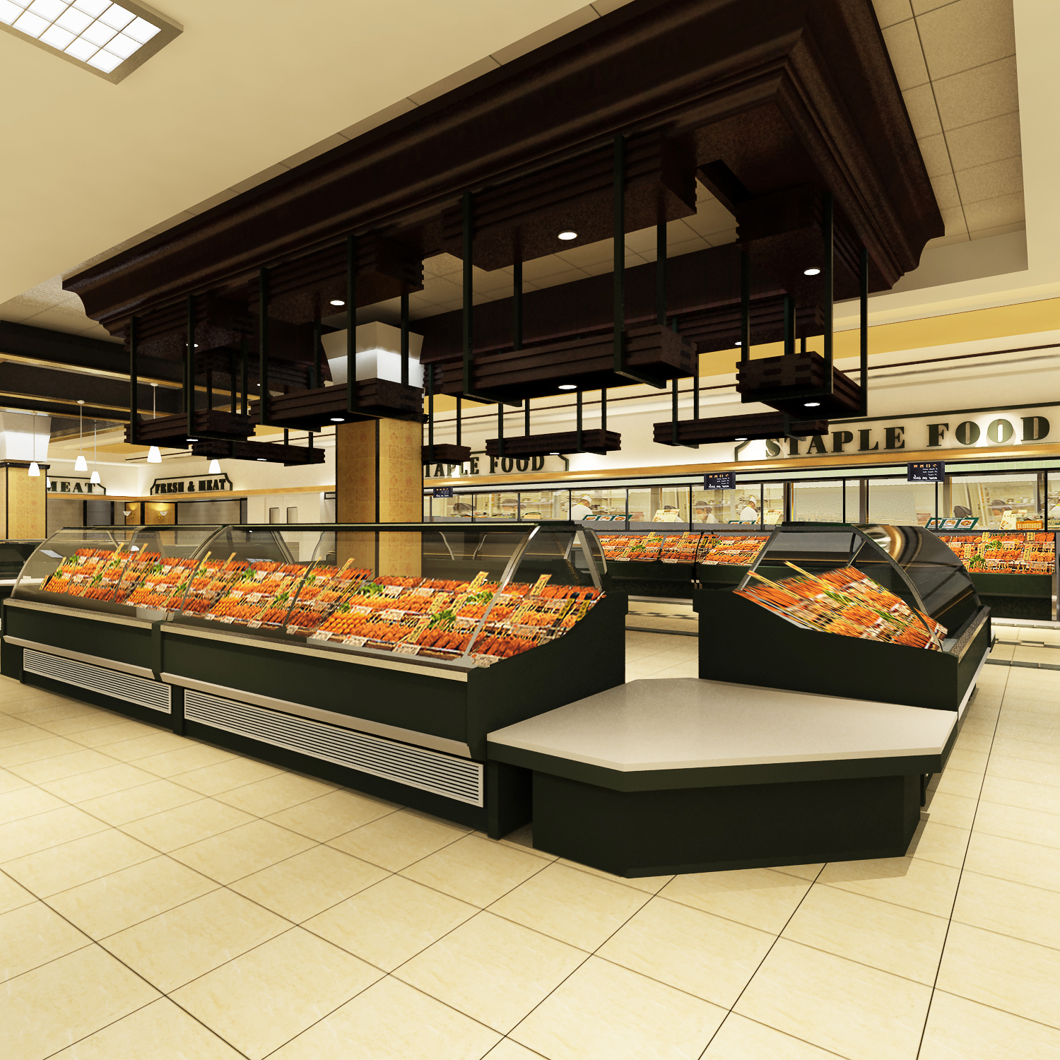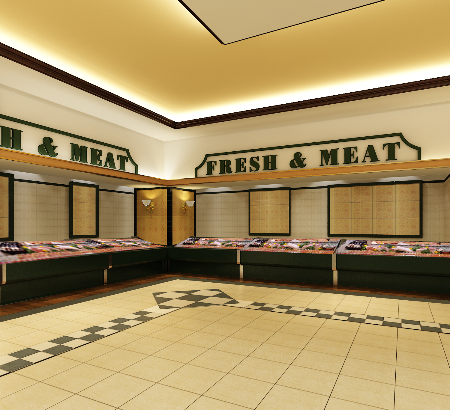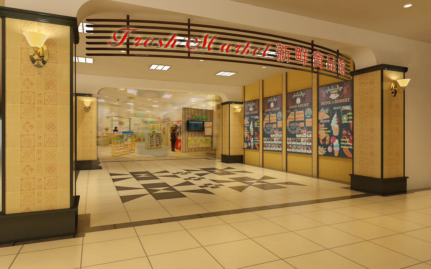 設計方案使用了美式超市的一些元素,比如柱頭、線條,通過整體風格的把握,再融合國內超市經營特點,創(chuàng)造了一個大氣,舒適、別致的購物空間!
