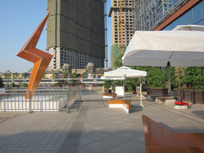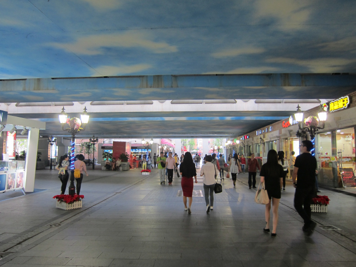 兩座橋覆蓋下的漢街段落,做成藍(lán)天白云,設(shè)計(jì)感很好。六點(diǎn)左右的時(shí)候,此段已經(jīng)亮起了路燈。