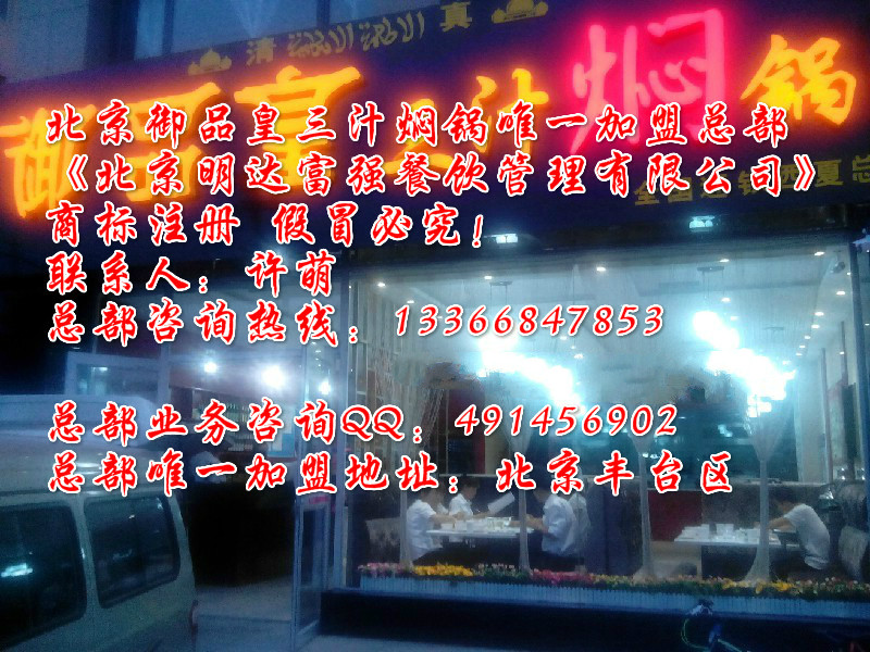 北京正宗御品皇三汁燜鍋加盟總部 商標(biāo)注冊(cè) 假冒必究!