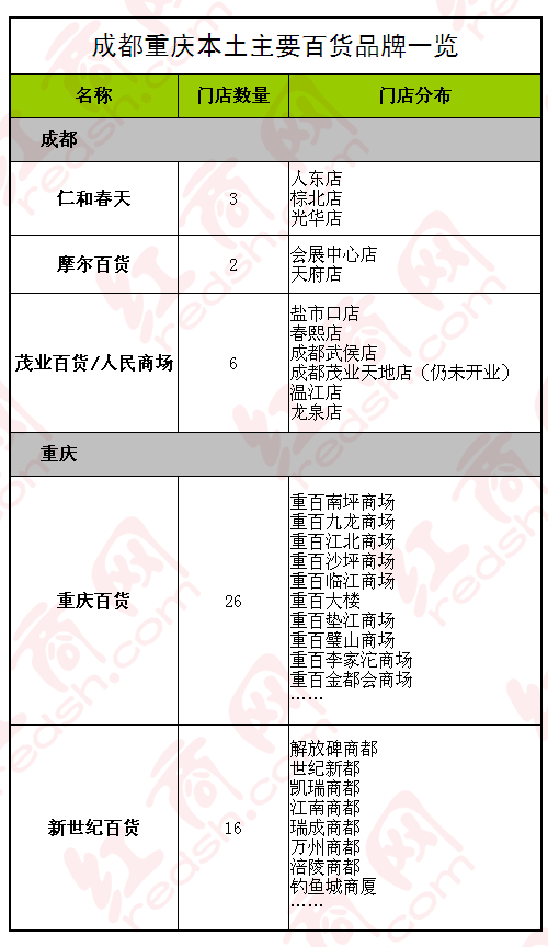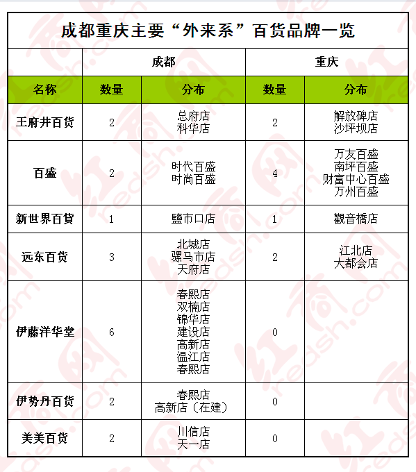 在成都與重慶發(fā)展比較好的還有王府井百貨、百盛、新世界百貨等。各“外來系”百貨在成渝分布與數(shù)量請參見下表。