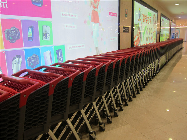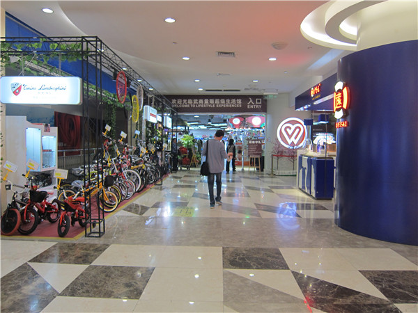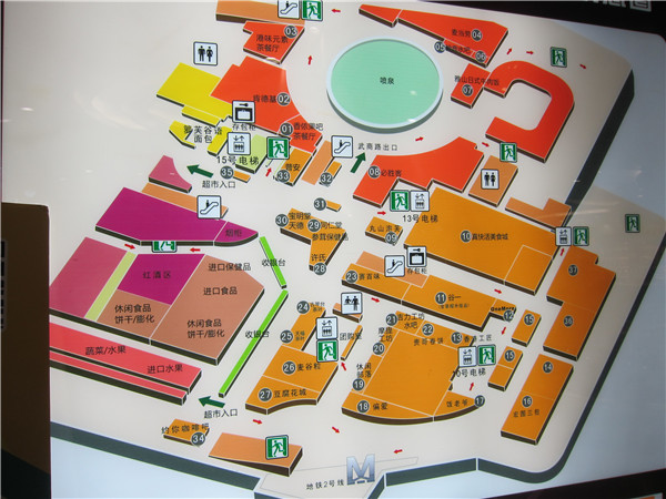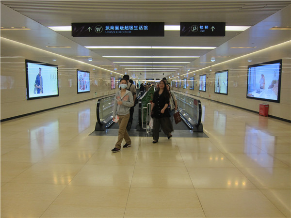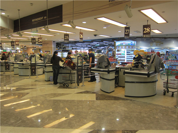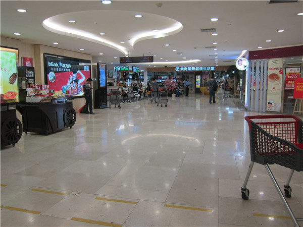 武商量販超級(jí)生活館在武漢國際廣場地下一樓,由精品超市和美食廣場組成 武商量販超級(jí)生活館入口,長形電梯,真的很長很長,兩邊墻壁上掛有商品圖 超市入口和收銀臺(tái) 小推車很有質(zhì)感