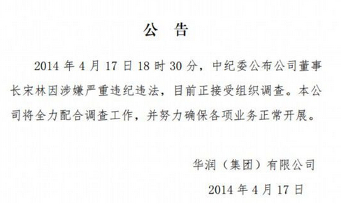 華潤(集團)有限公司17日晚發(fā)布公告稱,中紀委公布公司董事長宋林因涉嫌嚴重違紀違法,目前正接受組織調(diào)查。本公司將全力配合調(diào)查工作,并努力確保各項業(yè)務(wù)正常開展。