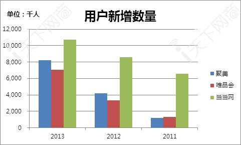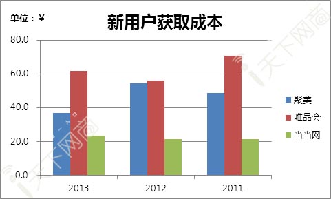 而從用戶總量上看,2013年聚美總共獲得了820萬的新增用戶,較上一年420萬大幅增加。同時,聚美的單個用戶獲取成本大幅下降,從54元下降到了37元。而值得注意的是,同期唯品會和當當網(wǎng)的用戶獲取成本均出現(xiàn)了明顯的上升。