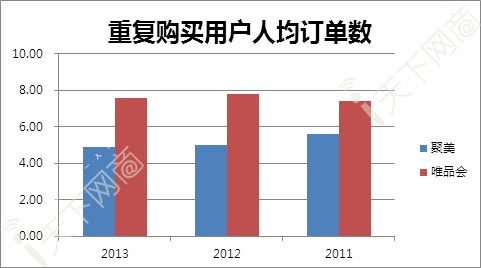 而對比用戶購買數(shù)據(jù)以后,我們發(fā)現(xiàn)一個很有意思的現(xiàn)象:上一年只消費一次的用戶數(shù)量與下一年的流失用戶數(shù)非常接近。唯品會和聚美的數(shù)據(jù)均表現(xiàn)出這一規(guī)律。一個可能的原因是這些用戶的初次購買體驗并不理想,從而拋棄了該平臺。