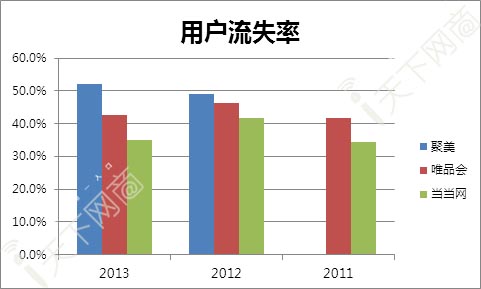 聚美2013年共流失掉250萬老用戶,而聚美2012年全年的活躍用戶也只有420萬。聚美的用戶流失率高達52%。