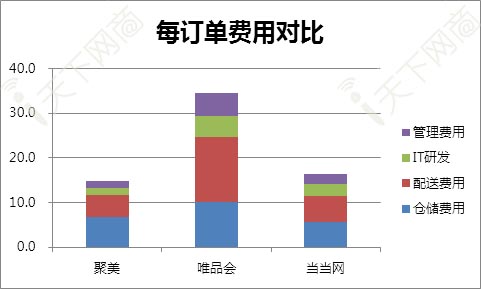 聚美除倉儲以外的三項費用均低于唯品會和當當網(wǎng)。以電商企業(yè)最主要的成本項物流費用來說,聚美每單總物流費用為11.8元,而唯品會和當當網(wǎng)分別為24.7元和11.4元。