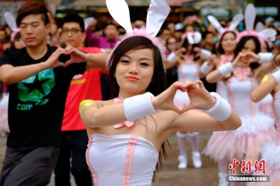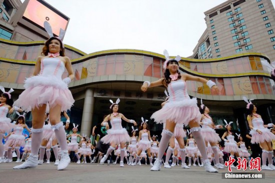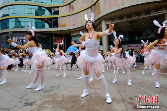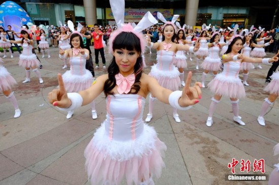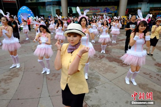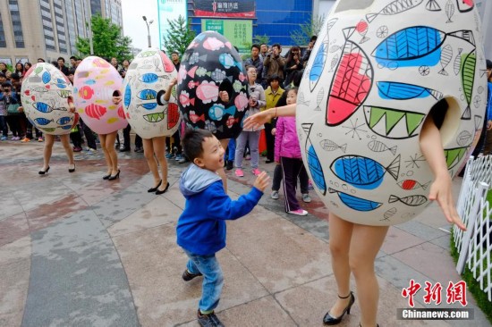 4月19日,北京某商場(chǎng)舉行復(fù)活節(jié)促銷宣傳活動(dòng),一群性感的“兔女郎”在街頭進(jìn)行“快閃”表演。 4月19日,一些打扮成復(fù)活節(jié)彩蛋造型的“蛋女郎”出現(xiàn)在北京某商場(chǎng)外,吸引了小孩們好奇的目光。 。ㄖ行律绨l(fā) 侯宇 攝)