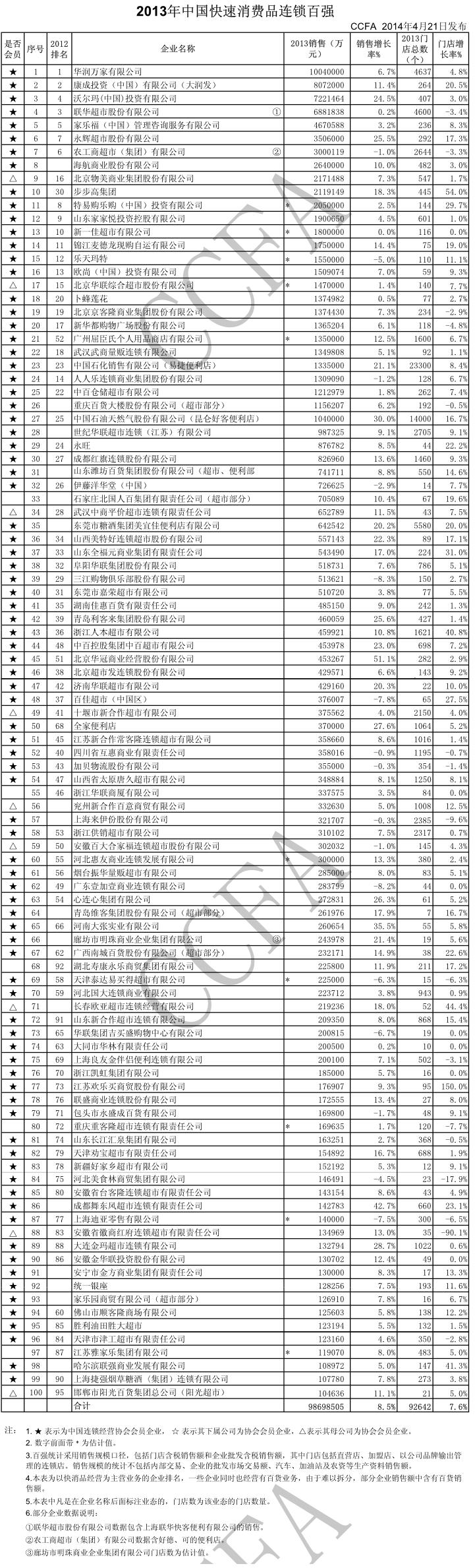 2013年中國快速消費品連鎖百強榜 華潤萬家第一聯(lián)商網(wǎng)消息:中國連鎖經(jīng)營協(xié)會“2013年度行業(yè)發(fā)展狀況調(diào)查”日前結(jié)束,“2013中國連鎖百強”今天發(fā)布。