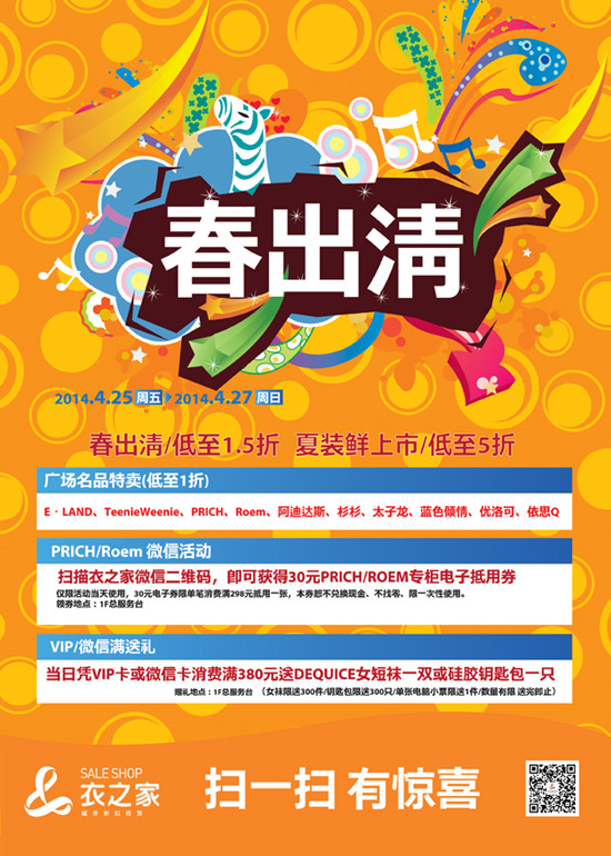 春出清——城東店:春出清低至1.5折,夏裝鮮上市低至5折;廣場(chǎng)名品特賣會(huì)低至1折;掃描二維碼即可獲得30元的PRICH/ROEM專柜抵用券一張;憑VIP卡消費(fèi)滿380元送短襪一雙或硅膠鑰匙包一只。