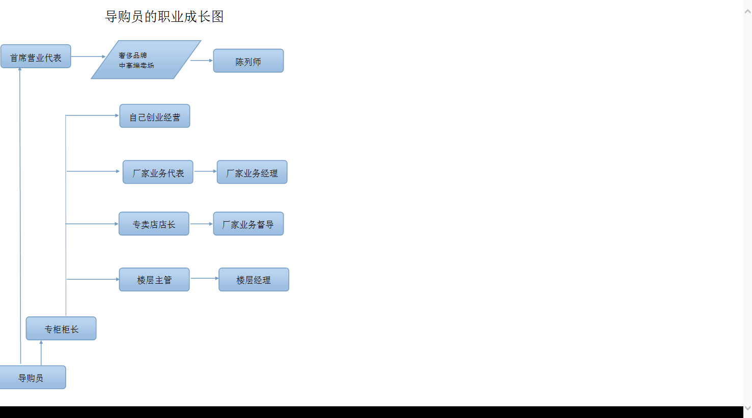 我認(rèn)為導(dǎo)購(gòu)員的職業(yè)成長(zhǎng)路徑還是很多的,下面就以一張圖做個(gè)演示。也希望導(dǎo)購(gòu)員朋友們可以通過(guò)良好的職業(yè)規(guī)劃讓自己的工作更加豐富多彩。