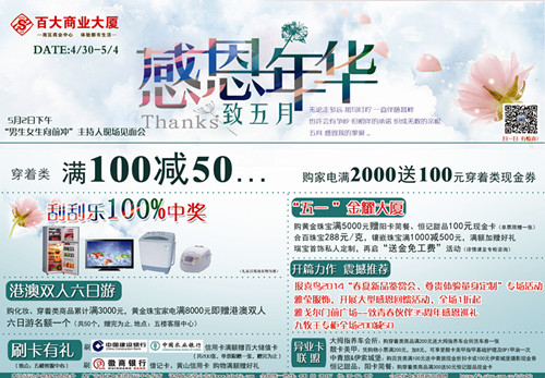 注:現(xiàn)金券限穿著類商品使用,單票限贈一張,憑第三聯(lián)小票至五樓客服中心領(lǐng)取,使用日期截止2014年5月4日。