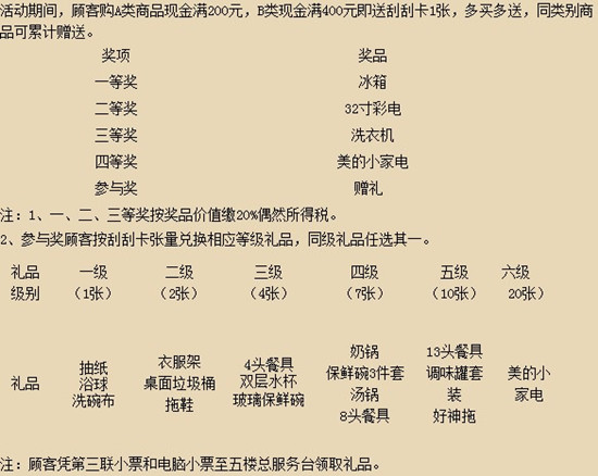 活動期間,累計購化妝、穿著類商品滿3000元,黃金珠寶家電滿8000元即贈港澳雙人六日游名額一個(顧客憑第四聯(lián)小票領(lǐng)取,數(shù)量有限,贈完為止)。
