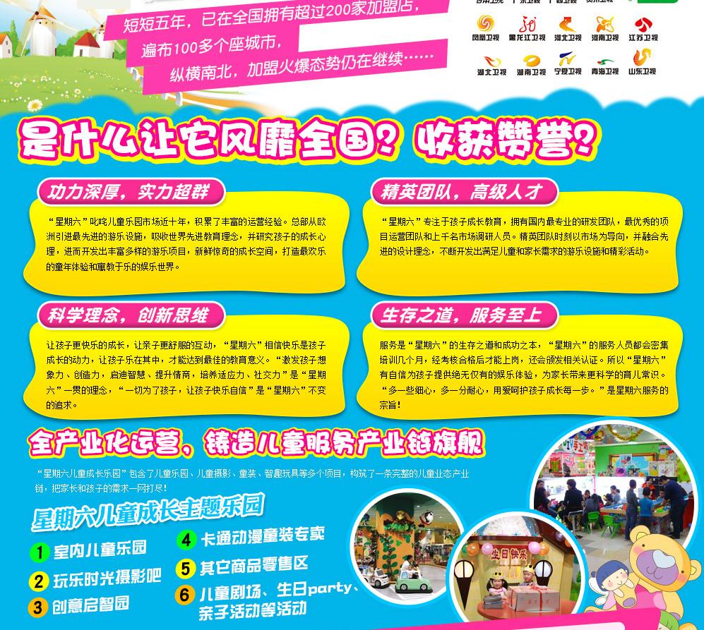 有實(shí)力才敢承諾,有信心才敢于承擔(dān),有胸懷才敢于分享,有誠意才敢于合作。品牌榮譽(yù)共享、媒體廣告推廣、產(chǎn)品升級(jí)支持。區(qū)域壟斷保護(hù)、風(fēng)險(xiǎn)保證扶持、免費(fèi)培新支持、完善售后服務(wù)——星期六室內(nèi)兒童樂園七大扶持,讓創(chuàng)業(yè)者說:成功so easy!