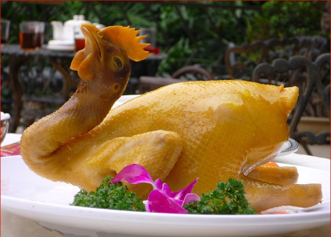 選用純生態(tài)土雞,配以少許香料,清水淡煮,熟透后,在用鮮湯浸泡冷卻。熟雞,用剁刀,切成細(xì)片