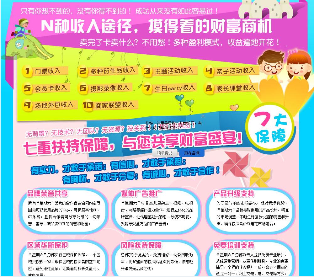 星期六兒童成長主題樂園是讓孩子瘋狂的樂園!讓孩子快樂成長的殿堂!讓家長放心的兒童俱樂部!星期六兒童成長主題樂園不光讓孩子玩得嗨,玩得美,更讓孩子在玩中學,玩中發(fā)展!靶瞧诹鶅和砷L主題樂園”顛覆了傳統(tǒng)意義上的兒童樂園,包含了室內(nèi)兒童樂園、攝影吧、啟智園、童裝專賣、兒童產(chǎn)品零售和兒童劇場六大部分,這是星期六兒童成長主題樂園品牌運營中心綜合了多個兒童教育專家意見所得出的黃金搭配,真正構(gòu)建兒童一站式玩樂、成長的殿堂!13269696387