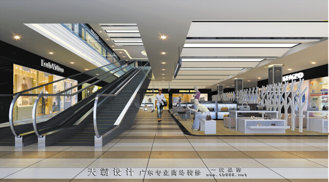 珠海福樂購百貨中庭設計以簡約的造型與濃厚的氣氛取勝,細節(jié)處處處彰顯美感。中庭在視覺上以造型不一的線形為主,輔以細節(jié)上的差異,所設計的天花板、商品展示區(qū)、電梯無不洗練大氣,其中尤以商品展示區(qū)出彩。商品展示區(qū)白色樹形屏風一字擺開,延伸了前后的視線,提升了百貨中庭的美感。中庭開放式的商品展示區(qū)琳瑯滿目的箱、包、鞋等女性日用品映入眼簾,極易激起女性的購買熱情。中庭周圍的櫥窗燈火輝煌,共同營造了繁華的購物空間。此外,珠海福樂購百貨中庭還承擔了疏通交通的功能,一座直達二樓的電梯便利地解決了客流疏導問題。