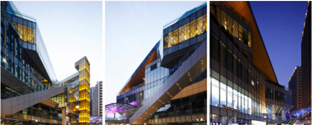 建筑造型由多組三角板塊組成,板塊間的排布定位結(jié)合了平面商業(yè)功能和不同的立面要求。通過板塊組的功能定位自然的構(gòu)筑成建筑曲折的線條。這種形式與功能相結(jié)合的設(shè)計(jì)理念, 不僅實(shí)現(xiàn)了是將人流引導(dǎo)進(jìn)入到商業(yè)街,同時(shí)更將各個(gè)店面的造型塑造成整體靈動(dòng)的線條, 曲折的線條化店面相互映襯,使得購(gòu)物者無(wú)論身處哪一個(gè)角度, 都會(huì)有一間面向他們的店 面在恭候光臨。 此設(shè)計(jì)手法最大限度的提升了商業(yè)街內(nèi)部的購(gòu)物體驗(yàn)。