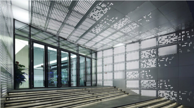 幕墻材料的選用是此次外立面設(shè)計(jì)的又一亮點(diǎn),通過運(yùn)用絢彩復(fù)合鋁板,形成了一個(gè)色彩 繽紛的外幕墻效果。同時(shí),出于渲染整體商業(yè)氣氛的考慮,幕墻結(jié)合了一些必要的展示功 能如廣告標(biāo)識(shí), 燈箱和三個(gè) LED 屏幕,位置面相人流活動(dòng)的主要區(qū)域, 加強(qiáng)了商業(yè)的綜 合氣息。此外被設(shè)計(jì)在復(fù)合鋁板上洞口通過其后面所帶的暗藏?zé)粝,在晚間亮起時(shí)刻射出 柔和的點(diǎn)式燈光,形成了繁星點(diǎn)綴的效果。