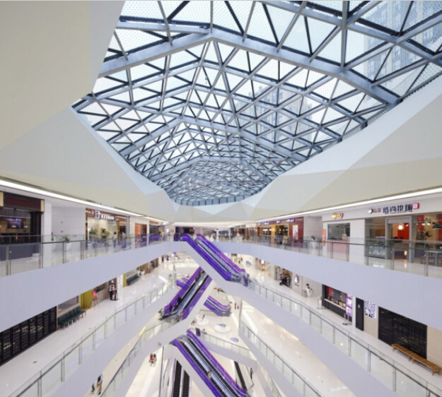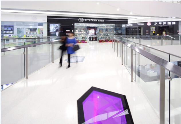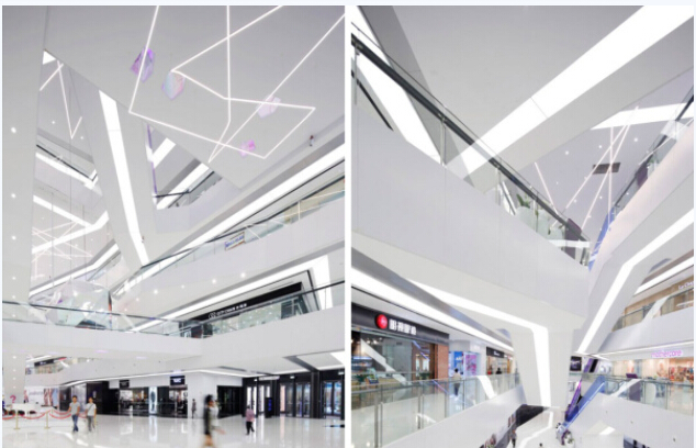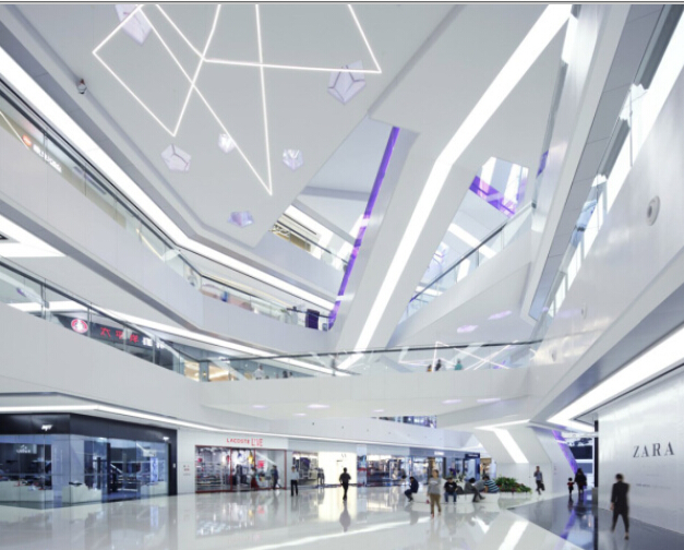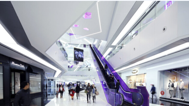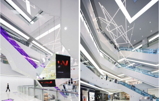 做為外立面鉆石面延續(xù)入室內(nèi)的晶體 LED 廣告寶石懸吊于中庭,成為進(jìn)入商場(chǎng)的視覺中心。質(zhì)樸的白色室內(nèi)中庭由于具有雕塑感的位于中庭中部的彩色扶梯而強(qiáng)烈生動(dòng)起來(lái)。