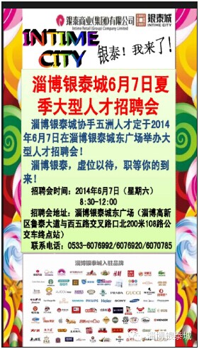 淄博銀泰城2014年夏季人才招聘會(huì)6月7日將在淄博銀泰城東廣場(chǎng)啟動(dòng),這座規(guī)模巨大的商業(yè)中心即將揭幕起航。想找心儀工作,淄博銀泰城在此--職等你來(lái)!