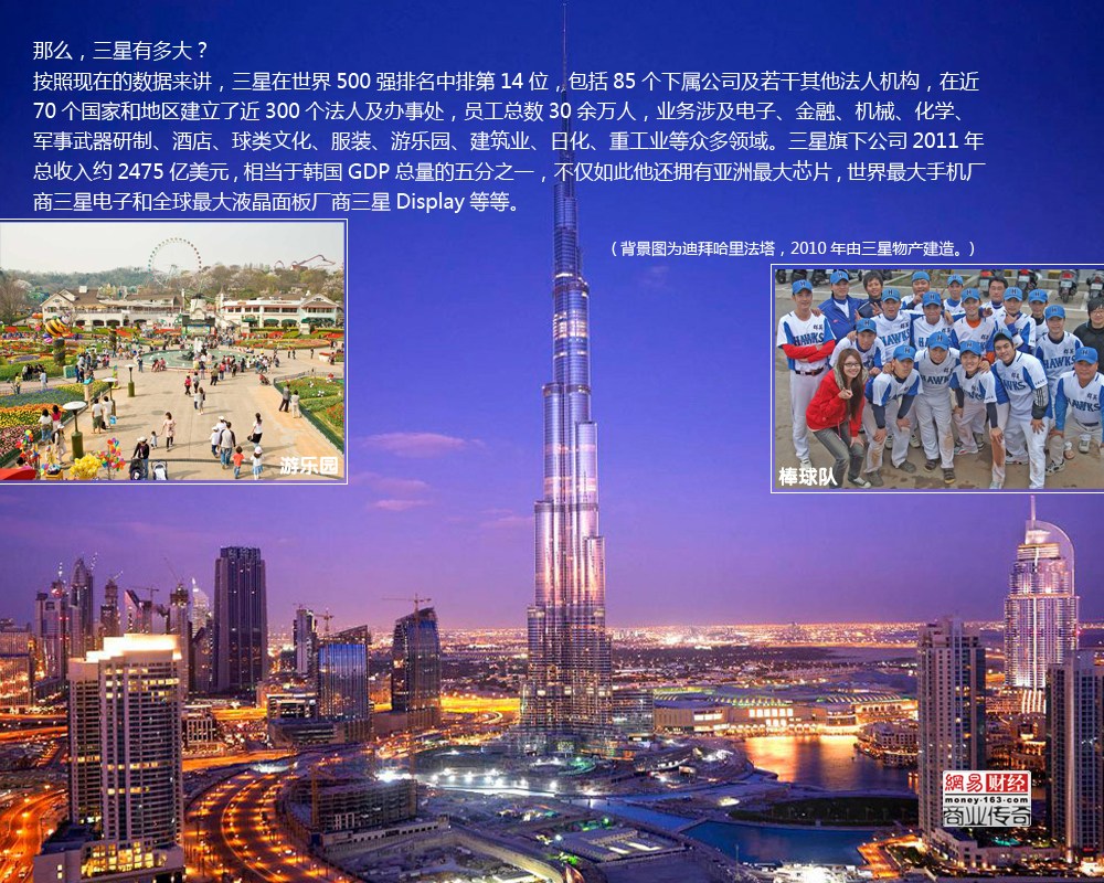 那么,三星有多大?按照現(xiàn)在的數(shù)據(jù)來講,三星在世界500強排名中排第14位,包括85個下屬公司及若干其他法人機構(gòu),在近70個國家和地區(qū)建立了近300個法人及辦事處,員工總數(shù)30余萬人,業(yè)務(wù)涉及電子、金融、機械、化學、軍事武器研制、酒店、球類文化、服裝、游樂園、建筑業(yè)、日化、重工業(yè)等眾多領(lǐng)域。三星旗下公司2011年總收入約2475億美元,相當于韓國GDP總量的五分之一,不僅如此他還擁有亞洲最大芯片,世界最大手機廠商三星電子和全球最大液晶面板廠商三星Display等等。