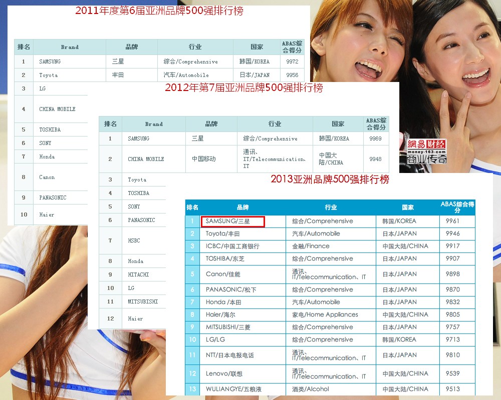 2013年9月9日在香港發(fā)布的“亞洲品牌500強排行榜”上。三星繼續(xù)蟬聯(lián)榜首,其中前十名中日本企業(yè)占據(jù)6席,韓國2席,中國大陸2席。從國別上就不難看出看,三星對于韓國的意義。