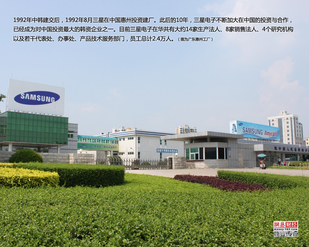 1992年中韓建交后,1992年8月三星在中國惠州投資建廠。此后的10年,三星電子不斷加大在中國的投資與合作,已經(jīng)成為對中國投資最大的韓資企業(yè)之一。目前三星電子在華共有大約14家生產(chǎn)法人、8家銷售法人、4個研究機構(gòu)以及若干代表處、辦事處、產(chǎn)品技術(shù)服務(wù)部門,員工總計2.4萬人。