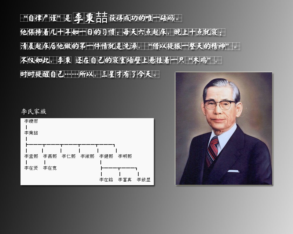 洪夏祥在《李健熙的第一主義》中稱,“自律嚴謹”是李秉喆獲得成功的唯一砝碼。確實,李秉喆對于每日的起居生活那是相當?shù)淖月、十分的嚴謹,幾乎無人能做到這幾十年如一日的習慣。他每天六點起床,晚上十點就寢;清晨起床后他做的第一件情就是洗澡,李秉喆是想“借以提振一整天的精神”。這種自我嚴格的管理可能煉就了他對企業(yè)管理的“清醒與認識”——著重于對時機的把握和拿捏。不僅如此,李秉喆還在自己的寢室墻壁上懸掛著一只“木雞”,時時提醒自己。所以我們想不正是這樣有了“清醒”以及“時時提醒”,三星才有了今天。
