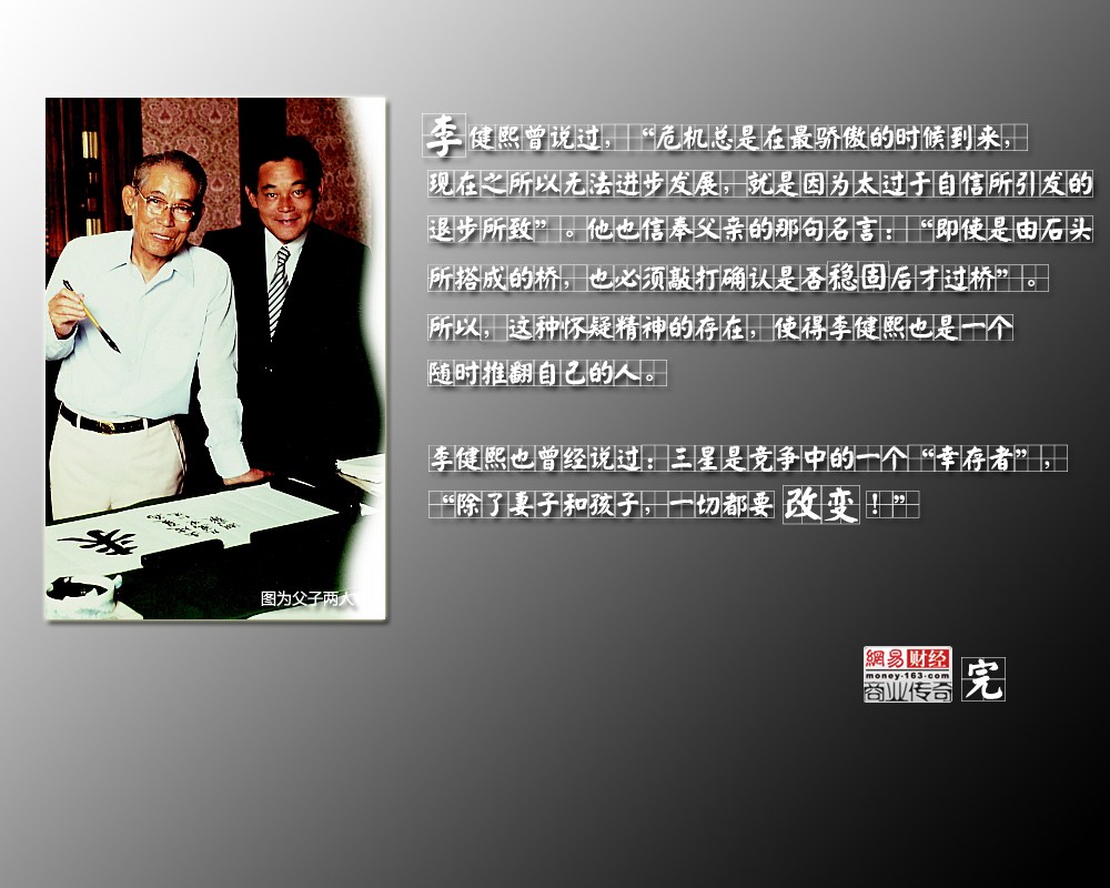 李健熙曾說過,“危機總是在最驕傲的時候到來,現(xiàn)在之所以無法進步發(fā)展,就是因為太過于自信所引發(fā)的退步所致”。李健熙沒有任何正式的博士學位,但他卻是養(yǎng)狗專家、高爾夫博士、機械方面的博士,更是日本歷史博士,所以有人說,李健熙的忍耐力是源自他對德川家康精神的理解。他也信奉父親的那句名言:“即使是由石頭所搭成的橋,也必須敲打確認是否穩(wěn)固后才過橋”。所以,這種懷疑精神的存在,使得李健熙也是一個隨時推翻自己的人。這有助于企業(yè)的管理,時時的接受新的東西。三星曾經(jīng)提出過一個觀點:永遠不要過久地做任何一件事情。李健熙也曾經(jīng)說過:“除了妻子和孩子,一切都要改變!”并且李健熙經(jīng)常說,三星是競爭中的一個“幸存者”,他的員工應(yīng)該感到一種永久性的危機感。即使在其光彩奪目的企業(yè)概況中,三星也表現(xiàn)得充滿憂慮!拔覀兡壳八鶕碛械奈恢迷 10 年后將會是過時的且不能維持的。在全球的業(yè)務(wù)發(fā)展中,迷戀于固步自封是愚蠢的!保▉碓矗壕W(wǎng)易)