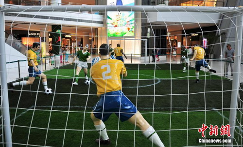 6月11日,濟(jì)南一商家將世界杯巴西隊(duì)“主場(chǎng)”比賽模型搬進(jìn)商場(chǎng),吸引消費(fèi)者關(guān)注。2014年世界杯足球賽開賽在即,為迎接此項(xiàng)盛事,濟(jì)南的商家紛紛打造別具匠心的球迷世界。 。ㄖ行律绨l(fā) 張勇 攝)