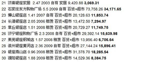 20 萊蕪銀座商城 2.75 2007 自有 百貨+超市 31,784.12 16,289.77