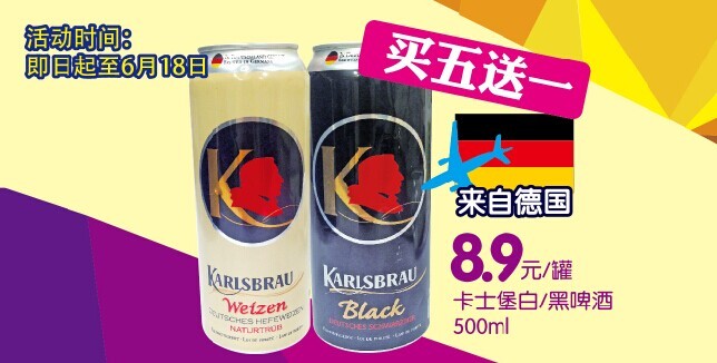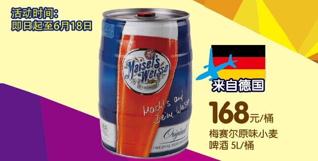 德國梅塞爾原味小麥啤酒5L桶裝每桶僅需168元。 德國卡士堡白/黑啤酒500ml每罐8.9元,買五送一! 促銷活動,品質(zhì)如一,親民特惠,抓住機會喲!